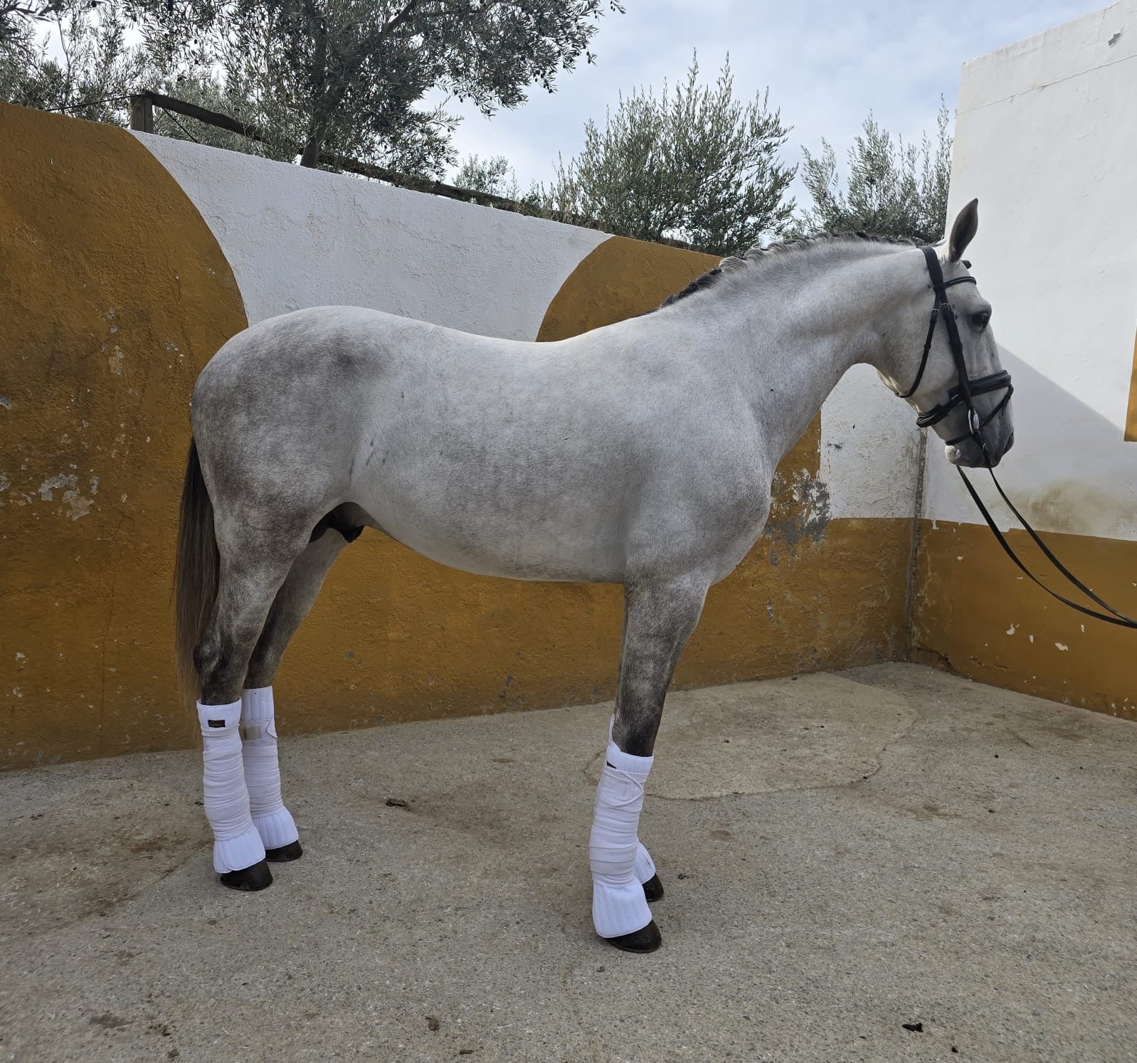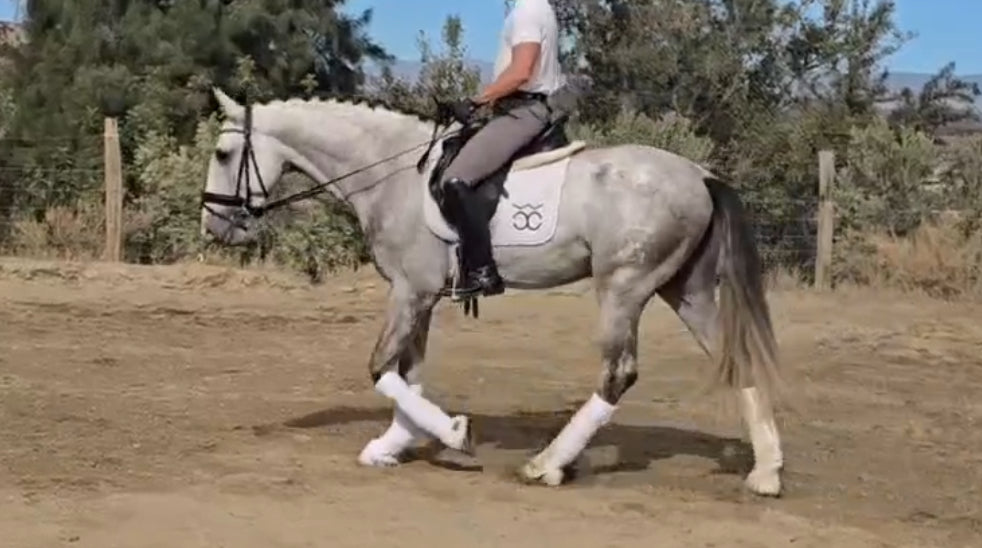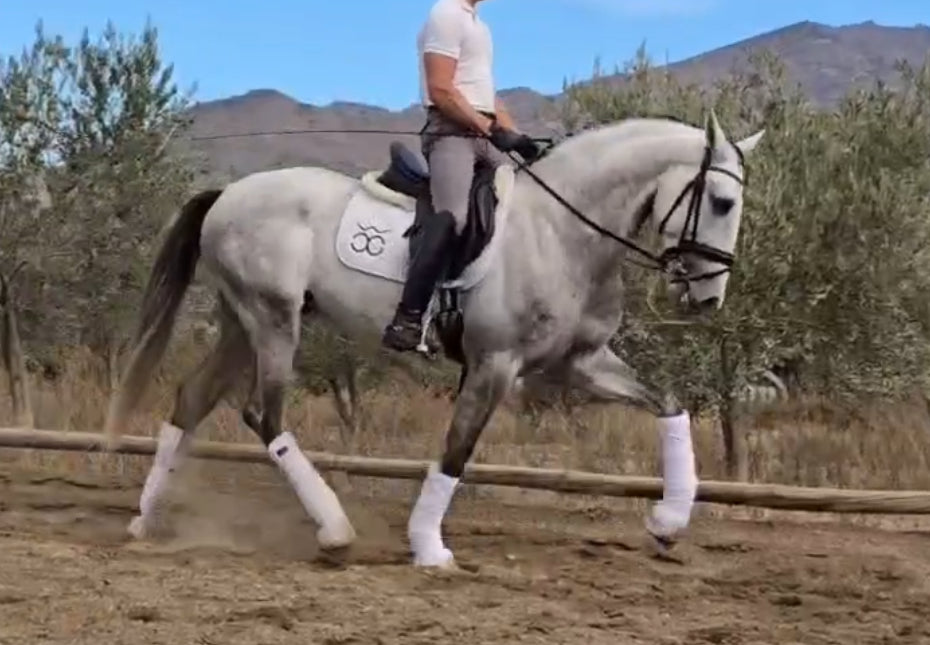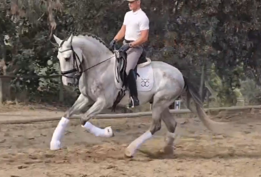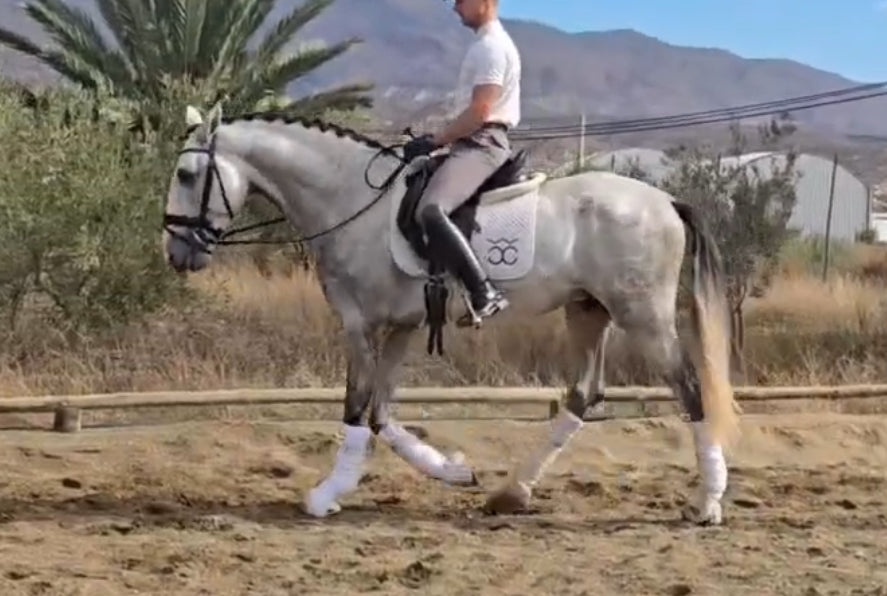 Level: Basic level ridden and developing with professional rider, has excellent behavior handleling and under saddle too even is a young horse he answer really good to the rider aids and is safe, he will not spook for the aid leg, easy to ride. Being lunged for warm up.